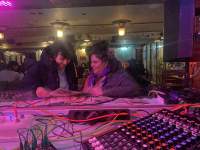 On stage, three people appear behind a metal structure. Purple light lights the space.