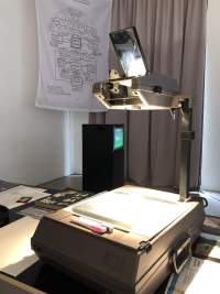 A slide with an image is being projected. The image is a photograph of a shelf of books annotated with colourful sticky notes.